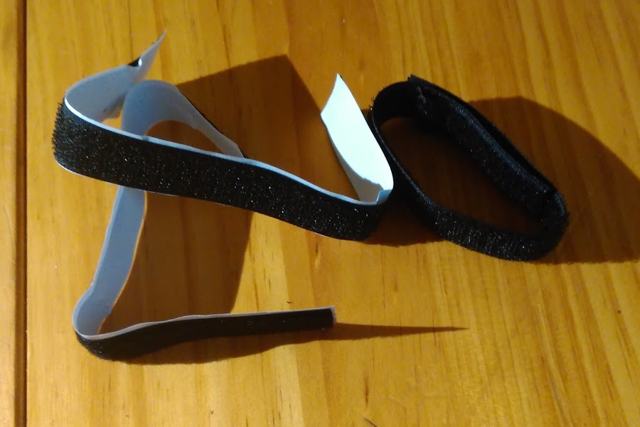 Hacemos una pulsera o brazalete para el móvil con los velcros, que nos servirá para poderlo fijar luego a muestra estructura y grabarnos desde arriba.