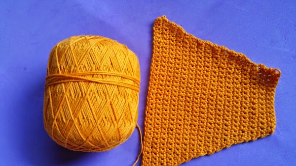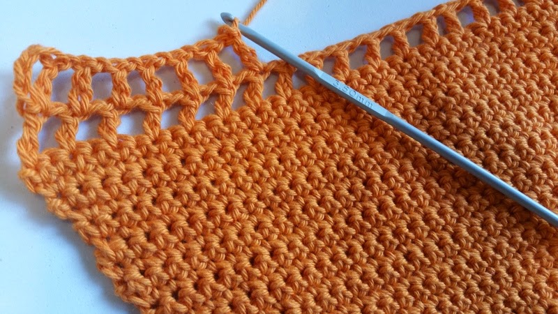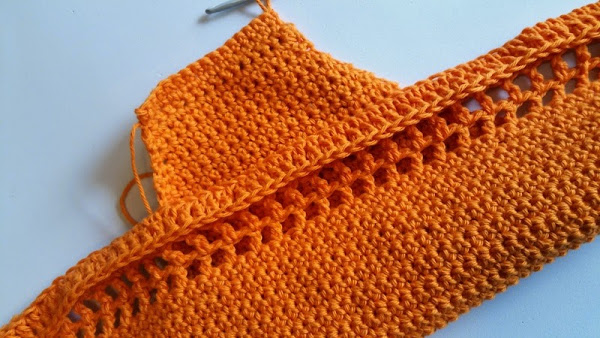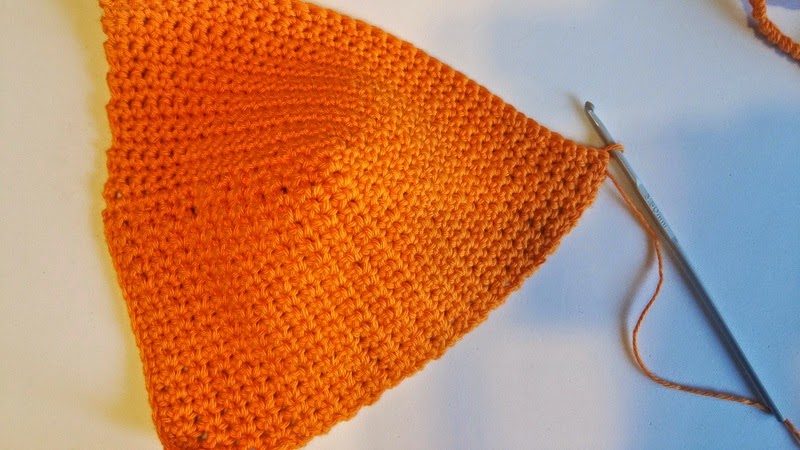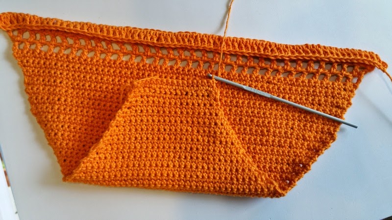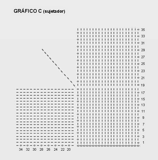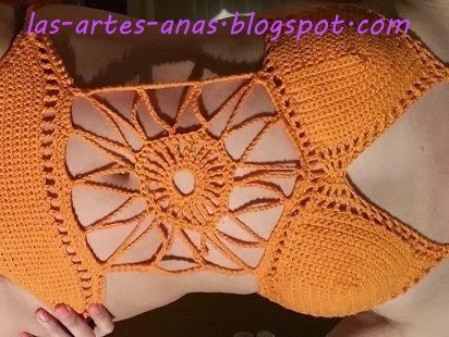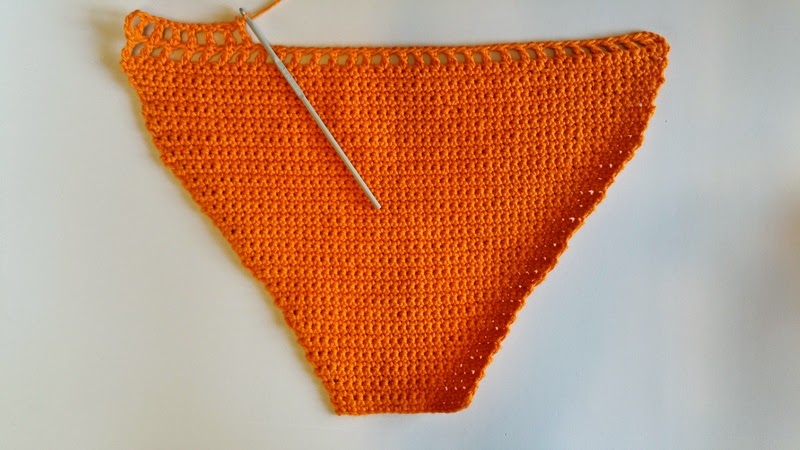 Para guiarme , he utilizado un viejo biquini, mi talla es la 42,fui aumentando al principio de cada vuelta un punto a ambos lados, cuando tengo 25 cms de alto, tejo dos vueltas de punto alto intercalados con 1 cadeneta