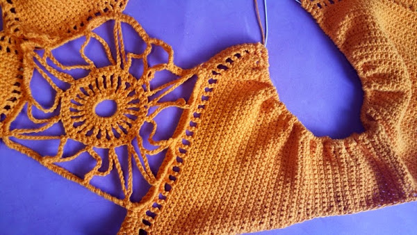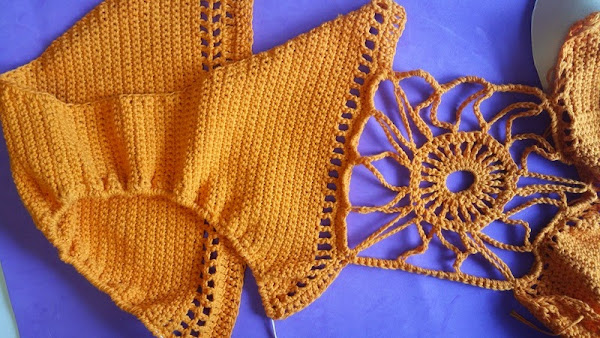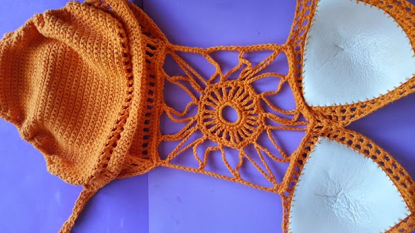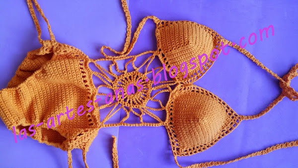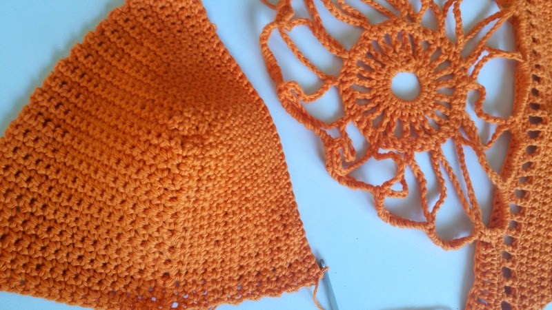 Acabo de unir el motivo mandala,a la braguita y el sujetador, luego bordeo a punto bajo, para colocar la goma que va integrada con punto cangrejo, no cortéis el hilo, solo girais la labor, pues el cangrejo se trabaja de izquierda a derecha