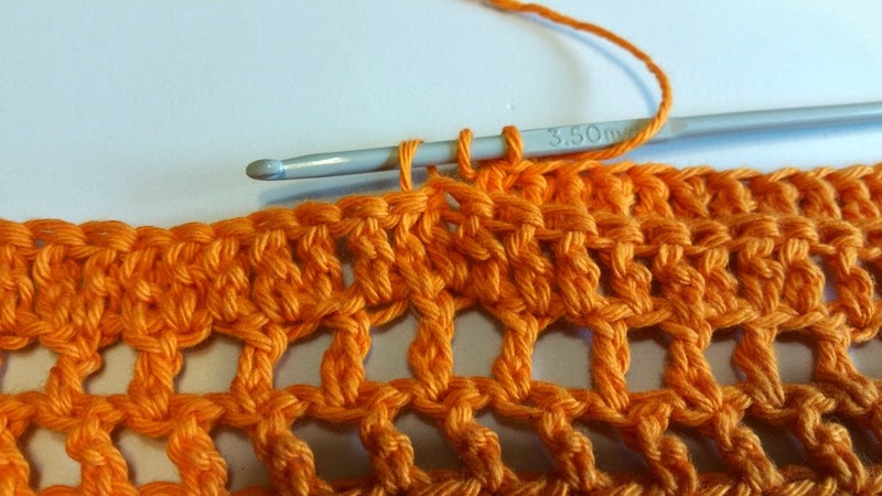 Para meter la cinta, tejo 2 vueltas mas de puntos altos, y para facilitar la doblez, tejo por la cadeneta posterior, cierro