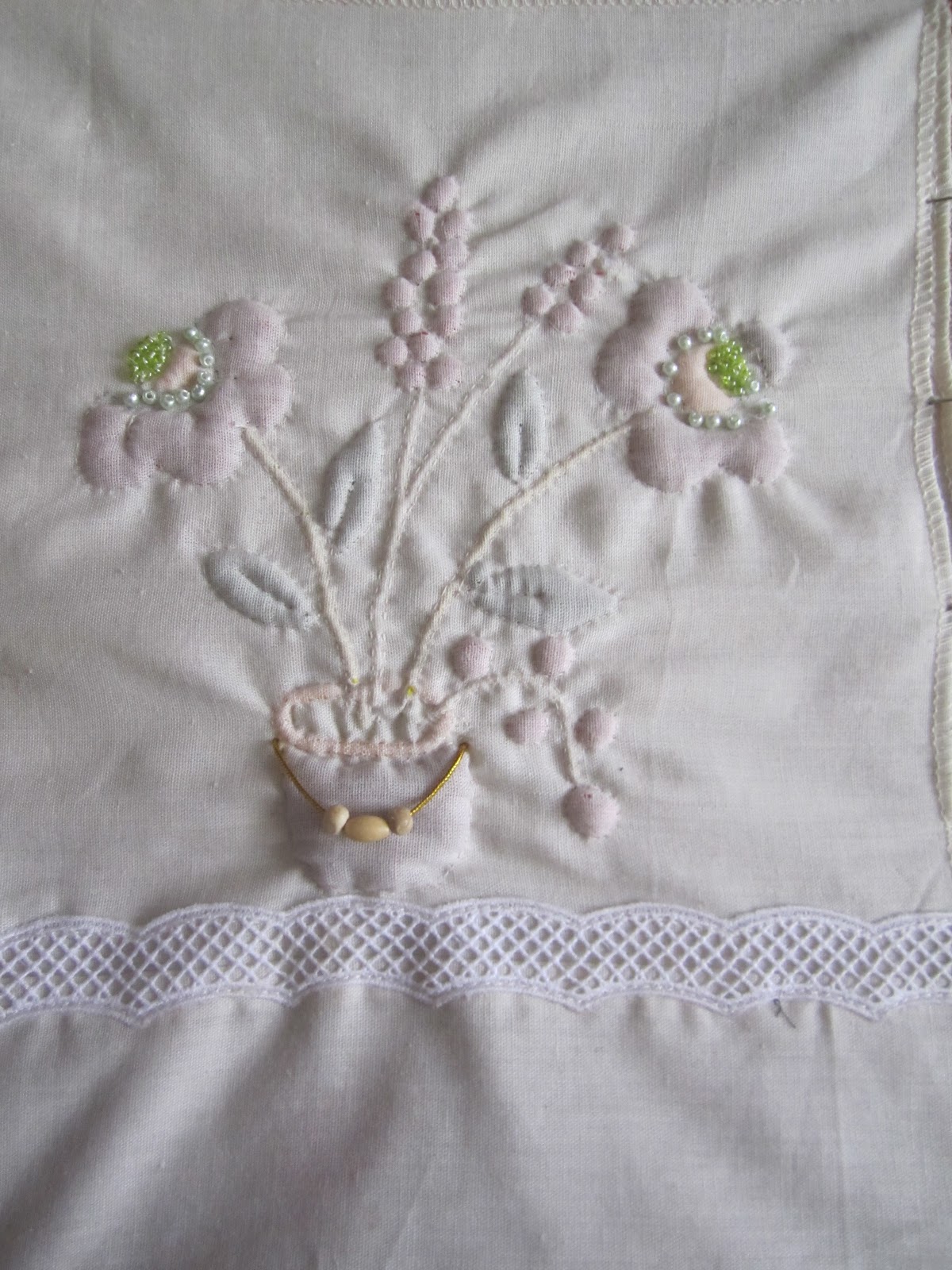 y por ultimo por hoy la labor de Mari carmen Madrigal quien ha usado tonos realemnte delicados para esta ocasion aportandole un acabado realmente fino. Me encanta!!!!! pero lo que meas me gusta es leer cuanto estan disfrutando mientras lo bordan!!!!!!!!