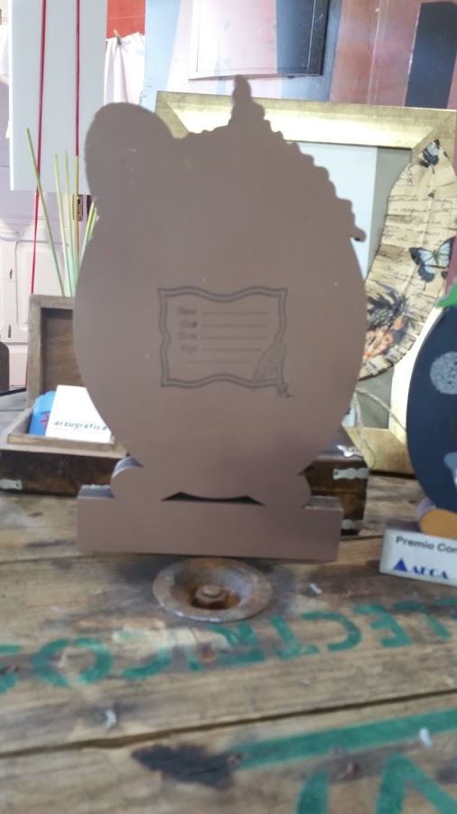 Los trofeos diseñados y hechos a medida para nuestros clientes es otro servicio que ofrecemos.Se hace todo en nuestro taller, diseño del trofeo, corte, impresion en papel de arroz y pasado al soporte de madera con decopage, rematando todo con detalles en embossing.