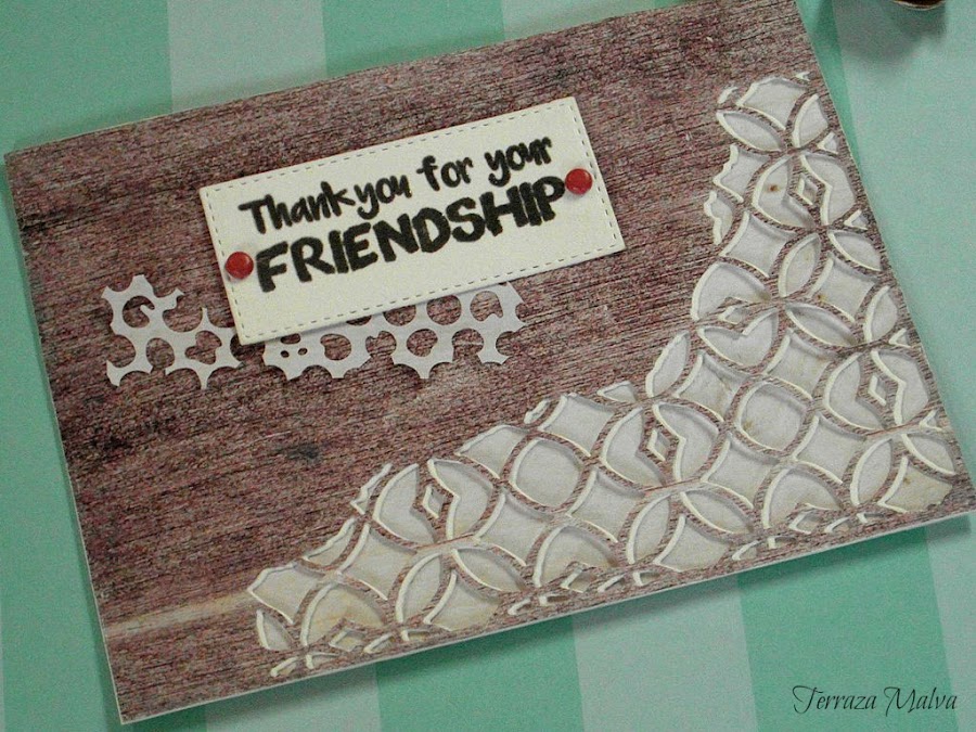 Los troqueles son de Tim Holtz, del kit "Mix Media". Para situar el sentimiento he troquelado un rectángulo también en papel acuarela y he estampado el mensaje de amistad del kit de sellos "Ubud Dreams" de Kaisercraft. Con un par de brads pequeños he querido simular que el cartel está "clavado" a la madera.