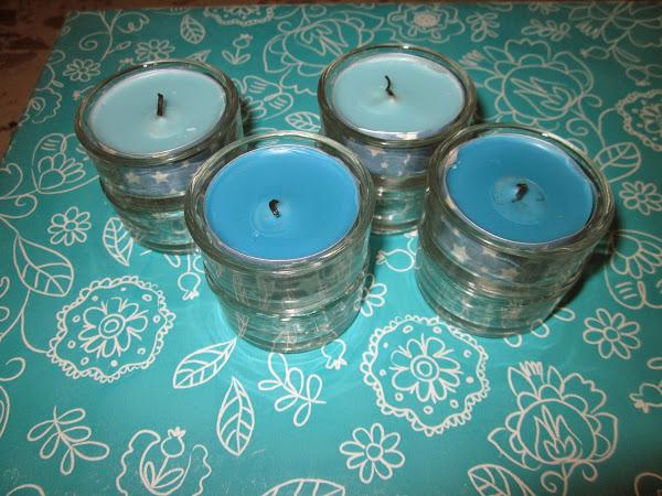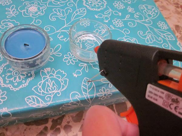 Cuando la colgué me di cuenta de que las velas pequeñas apenas se veían, así que tuve que buscar una solución. Como el paquete de portavelas traía 12 unidades y tan sólo iba a utilizar 4, decidí usar la pistola de silicona y unir dos unidades para que quedaran más altas.
