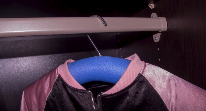 1. Coloca un tubo de piscina en los lados de la percha. Recorta ese trozo y haz un corte vertical para abrirlo.2. Del lado contrario al que has hecho el corte, haz un corte en el medio para meterlo en la percha. Voilà! Este truco es excelente si quieres colgar camisas sin que quede marca.