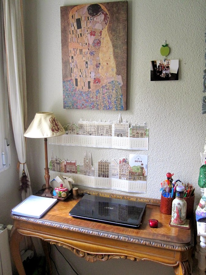Y este es el espacio en el que escribo en el blog (entre otras muchas cosas). Amo mi mesa, la compramos en la misma tienda que la mesilla de noche. En realidad una consola para colocar en la entrada, pero me sirve de escritorio y me gusta mucho cómo queda. Sé creativo y usa muebles para una función diferente a la que tienen originalmente. En cuanto a lo que hay encima del escritorio, ya que el mío es pequeño, intento ser simple y tener sólo lo imprescindible. Perdonad el aspecto de la lámpara, se me rompió la pantalla y quería comprarme una igual pero no les quedaban más la última vez que fuimos. También tengo una cajita mexicana hecha en una calabaza en la que guardo sacapuntas, gomas, auriculares y esas cosas. Al lado una vela dentro de una caña de bambú, un porta-post it de alemania y mi agenda de Klimt (ya os la enseñé en un post de favoritos) que tengo abierta siempre por el día en que estamos para ver todo lo que tengo pendiente. También tengo mi botella de agua, uso una de Arizona porque es muy bonita y yo soy una esteta. Tengo también botes para lápices llenos de todo lo que necesito y por supuesto el portátil y su ratón. Intenta ser práctico sin sacrificar el buen gusto, puedes buscar cosas funcionales y que tengan un diseño que te guste.Encima del escritorio tengo un calendario con edificios de Gaudí que me compró mi padre en la finca de El Capricho y que, además de útil, me parece precioso. Encima de eso, un lienzo que reproduce el beso de Klimt que me regaló mi amigo invisible esta navidad y que adoro (es de la tienda Ale-Hop). Por último tengo colgada una foto de mis compañeras de trabajo en un marco improvisado que en realidad es lo que usan en Finlandia para colgar las toallas.