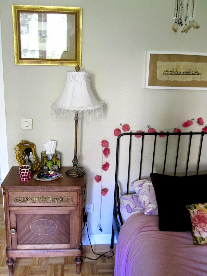 Junto a la cama, con es normal, está mi mesilla de noche que es de mis muebles preferidos de mi habitación. Me encanta el detalle metálico y las diferentes vetas de la madera. La compramos en una tienda de muebles usados de esos que ayudan a exdrogadictos a integrarse. Si no conoces estas tiendas, son una mina, encuentras auténticas joyas y algunas muy baratas (además se aceptan regateos, sobre todo si te llevas más de un mueble). La madera es maciza en casi todo el mueble, lo que es un plus. Las tiendas de muebles de segunda mano son un filón, opta por muebles de madera maciza que tienen mejor aspecto y duran toda la vida y huye de los contrachapados.Encima de la mesilla tengo más o menos lo básico: Una (preciosa) lámpara que me regaló mi madre en navidad, un marco increíble de Zara Home tipo Art Nouveau que me regaló mi padre, una vela, una caja de pañuelos y una enorme concha con perlas en formación dentro que uso para guardar las cosas de bisutería que más me pongo. En el cajón guardo lo que necesito cuando estoy en la cama: post it y lápiz para anotar y subrayar libros, un cuadernito, crema de manos y vaselina.