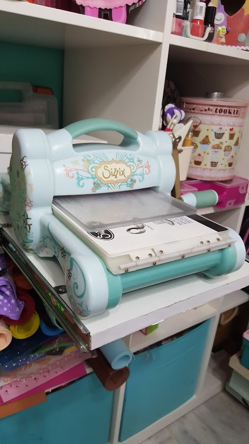 En uno de los huecos de esta estantería quise organizar mi Big Shot y los troqueles, como me pasaba con el plotter de corte, busqué una manera de poder utilizarla sin necesidad de desalojar la mesa de trabajo, por lo que se me ocurrió la idea de agregar a uno de los módulos una bandeja extraíble empleando para ello unos rieles de los que se utilizan para colocar los teclados de ordenador debajo del escritorio y una tabla cortada a la medida, de esta forma puedo utilizar la máquina sin necesidada de moverla de su sitio.