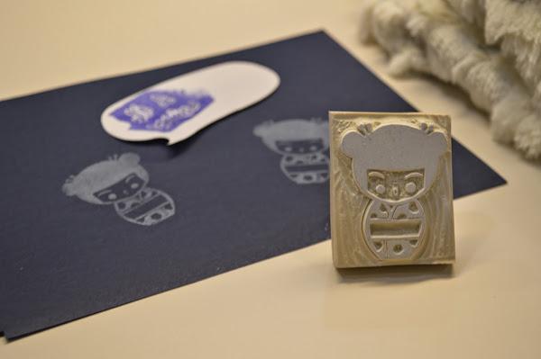 Y un trueque no lo podía enviar sin sello, por supuesto... además me dijo que le gustaba mucho un sello de una japonesa que hice hace tiempo, así que me puse a carvar y salió esto: