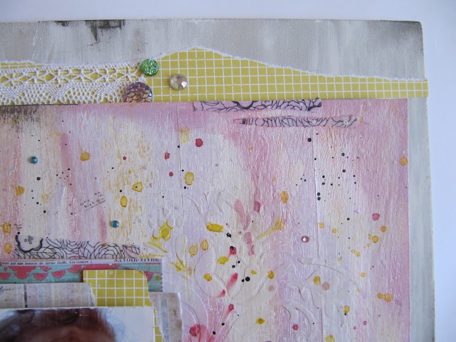 Con papel acuareable engesado, he ido pintado con distintas pinturas en tonos rosas, y color champagne, troqueles embosados, una mascara muy bonita de flores, porque quería que en este trabajo hubiese una composición floral con flores y adornos metalicos, curioso porque me gustan las flores, pero últimamente no las utilizo nada!, varios sellos, washis, brillantitos repartidos, enmarcando la foto con papeles mal cortados, las palabras he utilizado un abecedario y palabras troquelas y embosadas en unas pocas de veces
