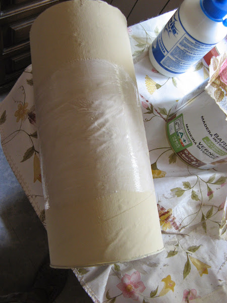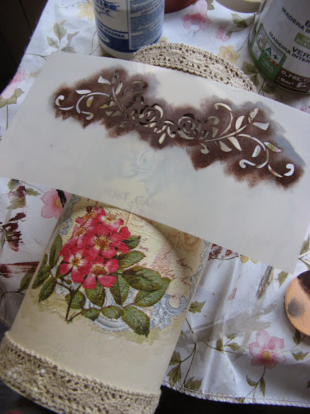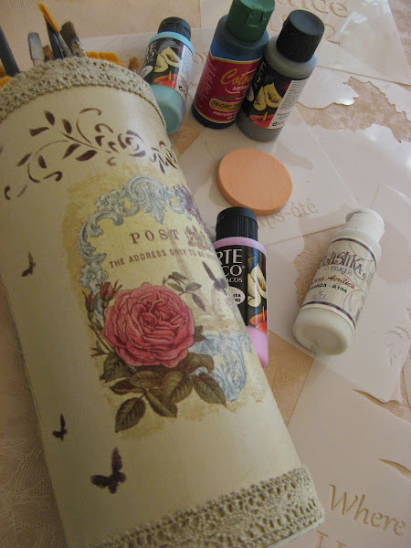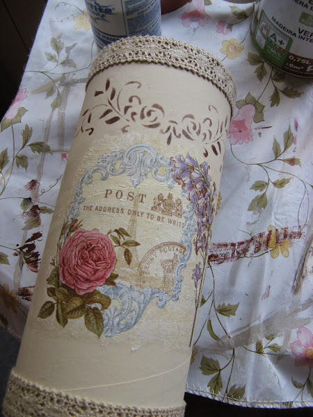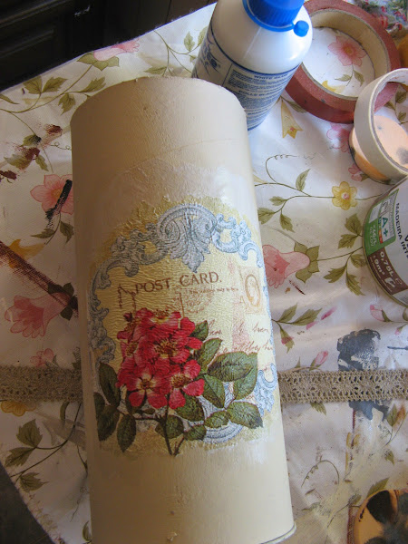 Primero lo pinté con Chalky finish tono "timeless" un tostado clarito muy bonito......empecé a decorarlo sin saber aún muy bien para qué lo iba a utilizar......una vez seca la pintura (que por cierto, seca rapidisimo) extiendo cola en el espacio que vá a ocupar el recorte de servilleta