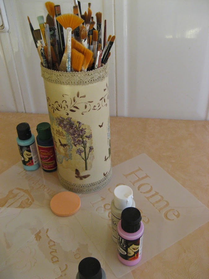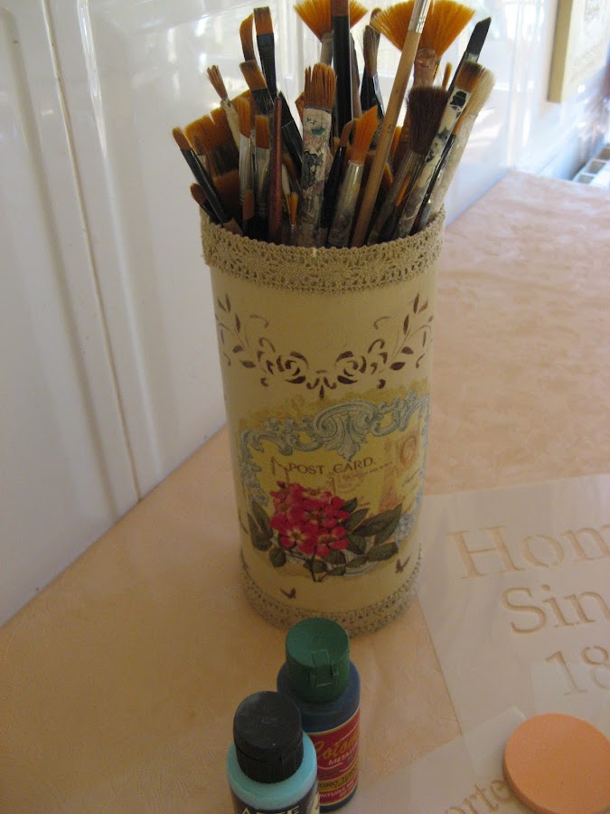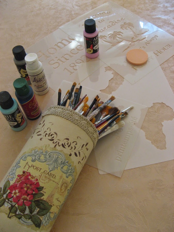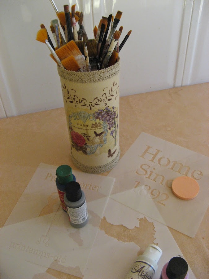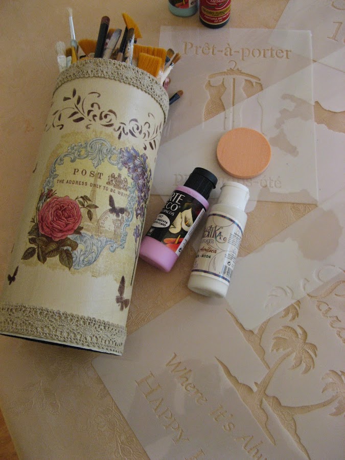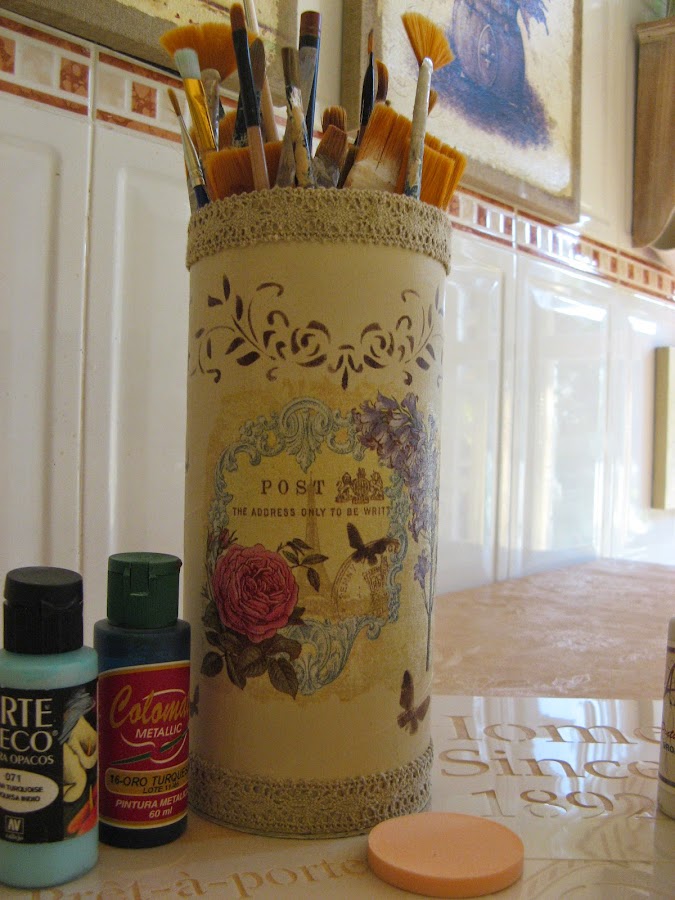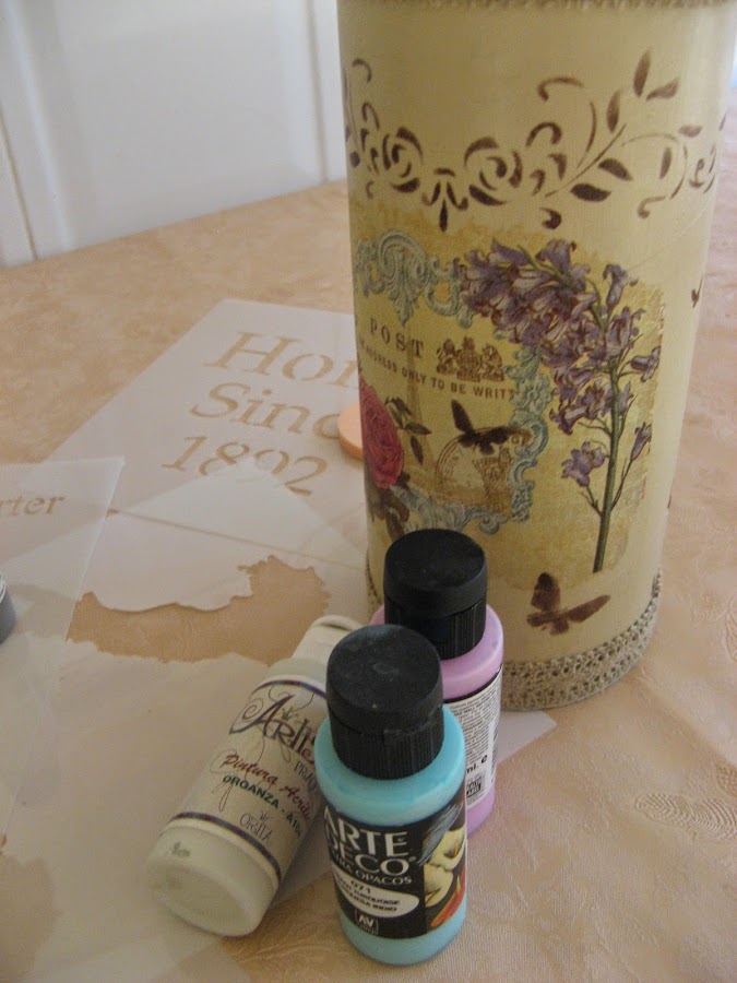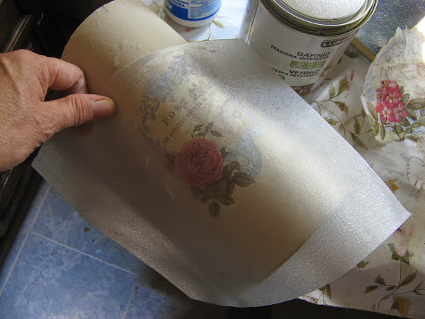 Primero lo pinté con Chalky finish tono "timeless" un tostado clarito muy bonito......empecé a decorarlo sin saber aún muy bien para qué lo iba a utilizar......una vez seca la pintura (que por cierto, seca rapidisimo) extiendo cola en el espacio que vá a ocupar el recorte de servilleta