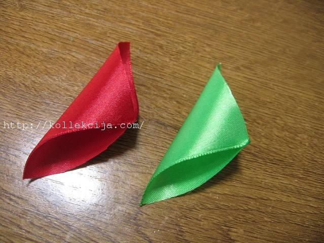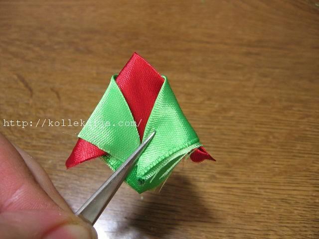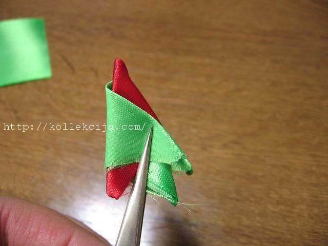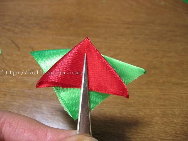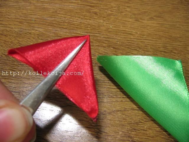 Doblamos las esquinas del triangulo verde hacia el centro abrazando la cinta roja.