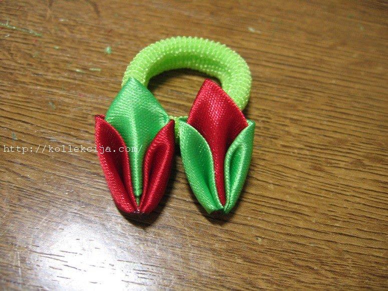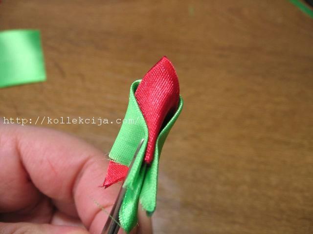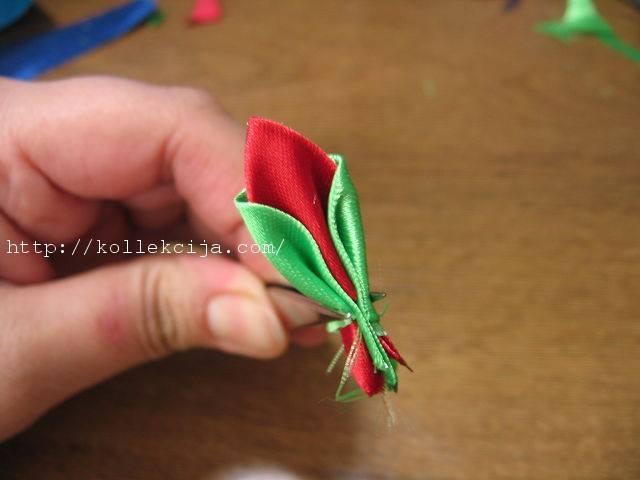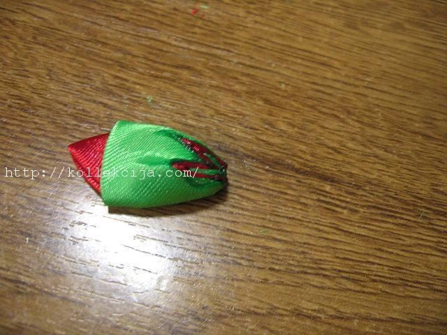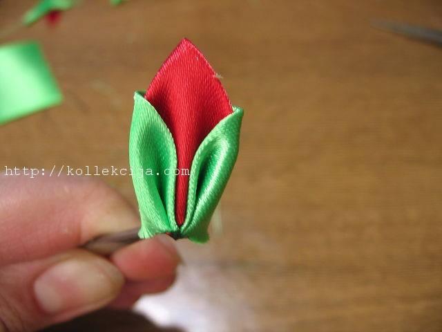 Cortamos la parte inferior sobrante y sellamos bien con el fuego. Nuestro pétalo tulipán de cinta raso está listo.