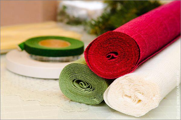 Para un tulipán de papel crepé necesitamos: papel crepé de color que nos guste y de color verde para las hojas, palitos de barbacoa o brochetas para los tallo, dulces (chocolate, caramelo, toffee… a su gusto), masking tape verde y tijera.