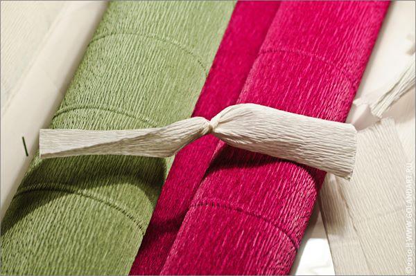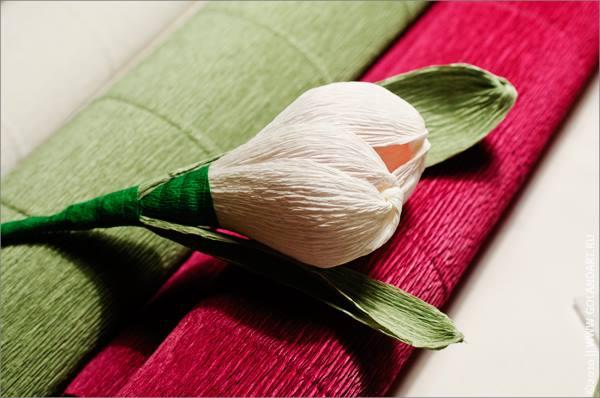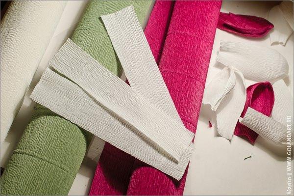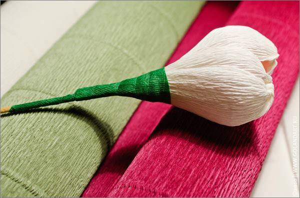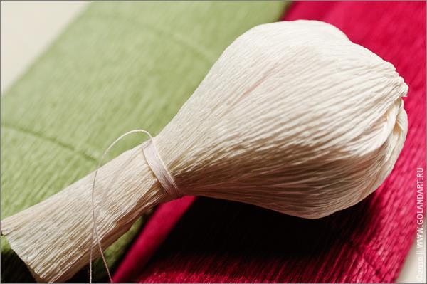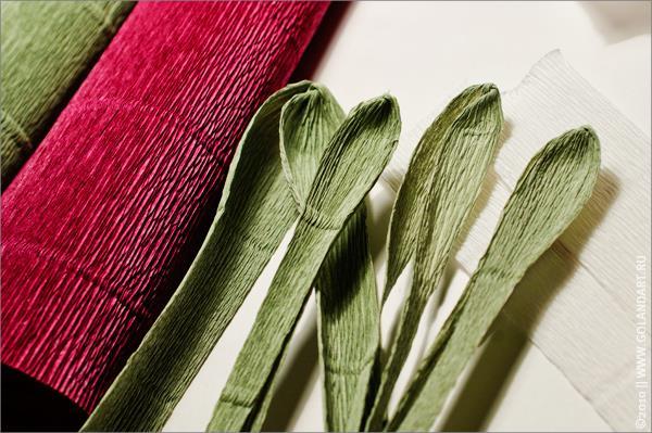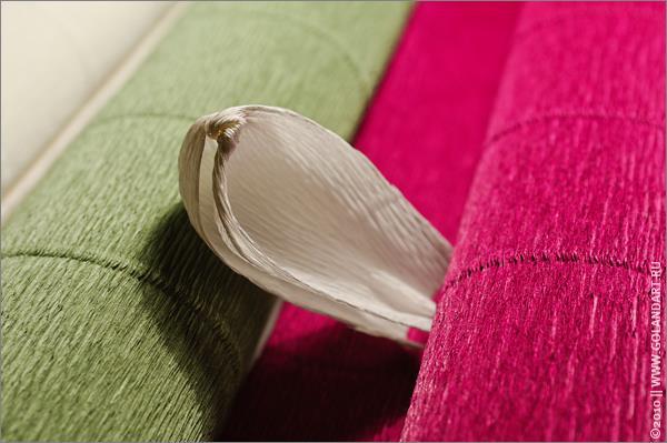 Para un pétalo de tulipán de papel crepé recortamos una tira rectangular de papel y la doblamos enrollando en el medio.