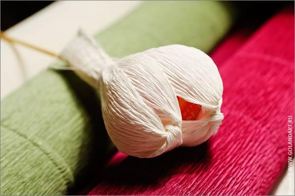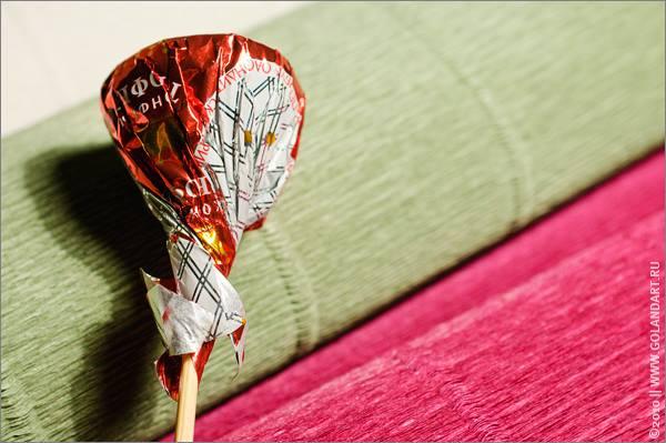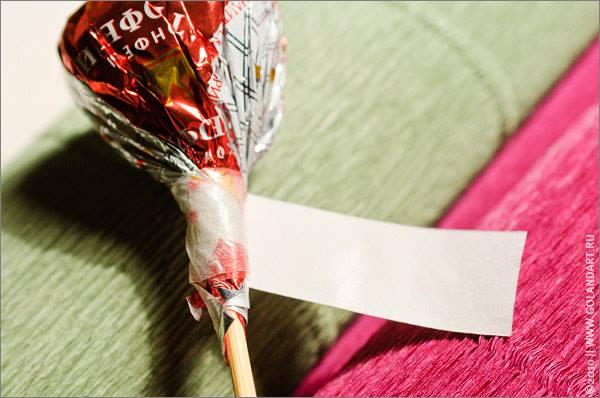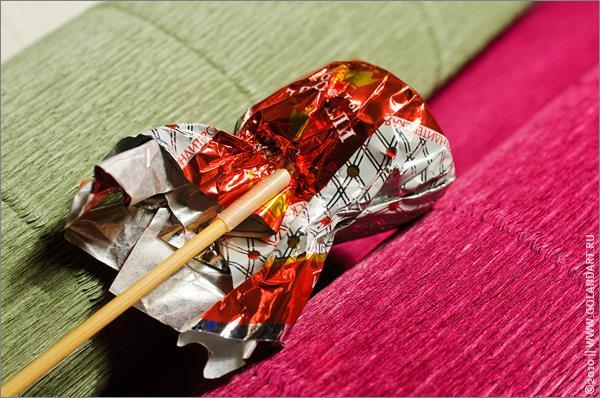 Cubrimos el bombón con 2 pétalos de papel crepé. Los fijamos en la parte baja primero con el hilo y luego tapamos todo con masking tape verde. Mientras repasamos con la cinta verde el palito de madera metemos unas hojas ovaladas de papel crepé verde.