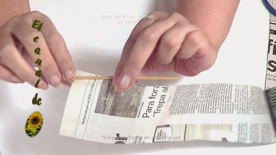 Cortamos una hoja de guía telefónica en cuatro partes y enrollamos con una brocheta de madera lo más delgada que encontremos, la mía es de 3mm de ancho.
