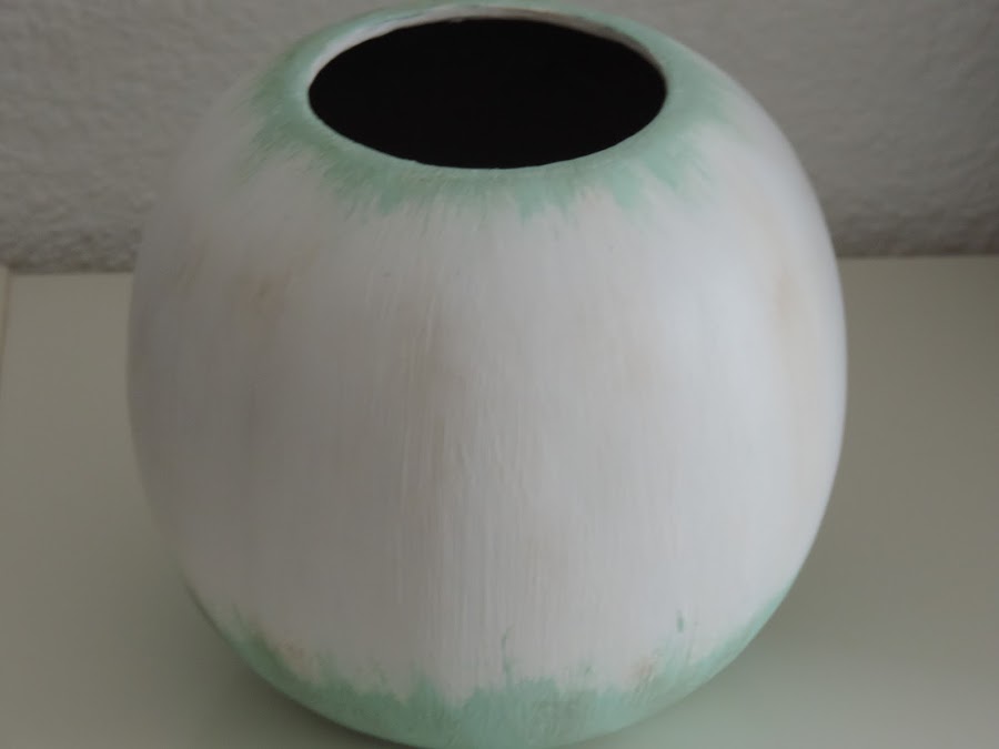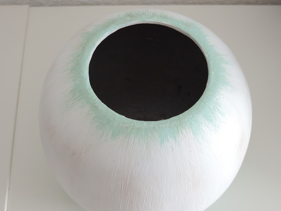 Bueno lo que hice fue utilizar chalk paint, blanco y mint. Primero pinté toda la bola blanca , excepto el interior , dentro ira una vela que sobresaldra por encima...le dí dos capas de manera quee quedaran los brochazos marcados a modo de lineas y después utilicé el verde mint para darle un aspecto diferente como degradado pero sin ser del todo así....