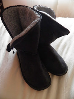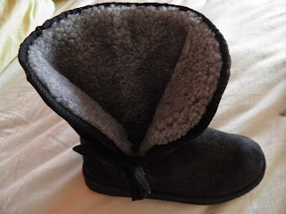 Para hacerles el "lavado de cara" usé un trozo de tela de borreguillo de color grís que tenía guardado. Aprovechando el bies que traía la bota, a puntada escondida, y con un poco de paciencia ;), lo fuí cosiendo.