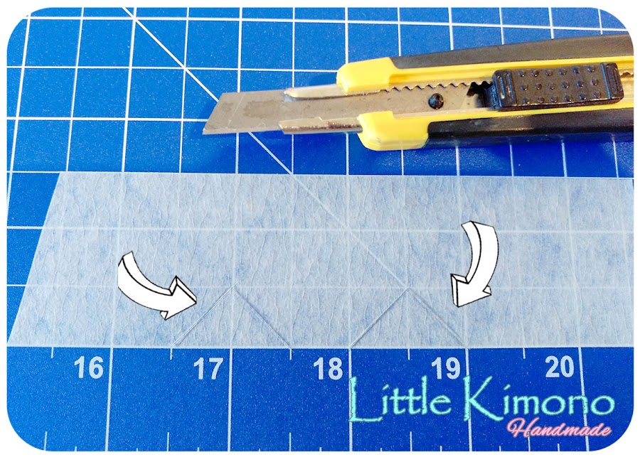 1. El primer paso es cortar la cinta de pintor del ancho de la zapatilla, y sobre la tabla de corte cortamos dos triángulos, podemos usar las lineas de la base como guías o dibujarlos con un lápiz.2. Pegamos la cinta centrada sobre la zapatilla y pintamos con la pintura para tela.