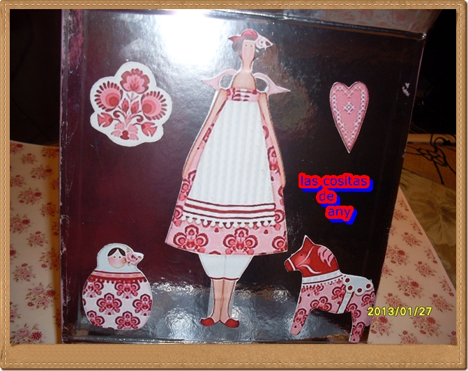 las famosas cajas del mercadona,alla vamos,esta la he pintado,le he hecho un stencil,y por dentro le he pegado unos motivos tildas...monisima me ha quedado