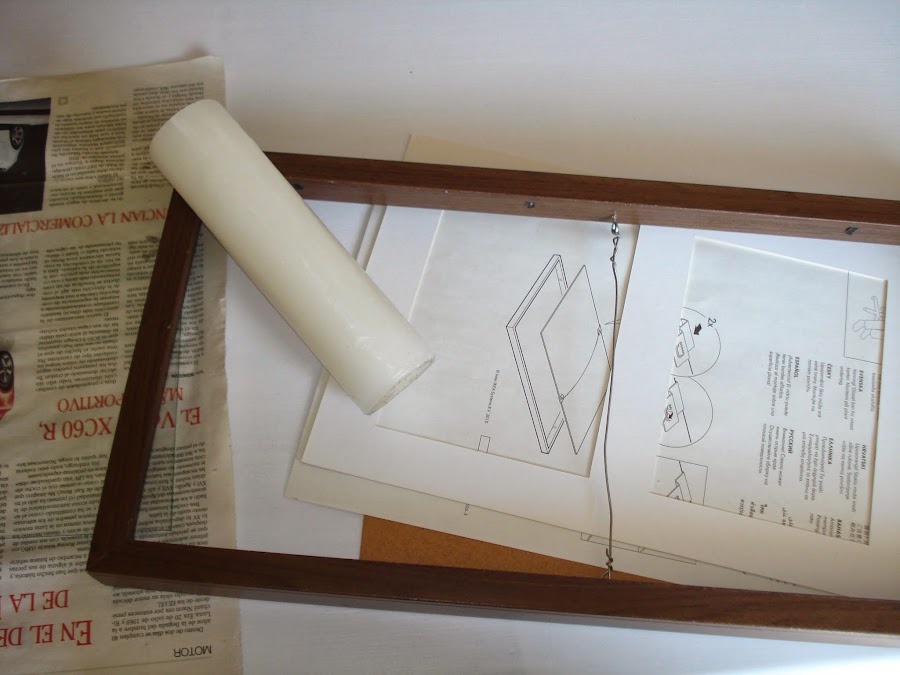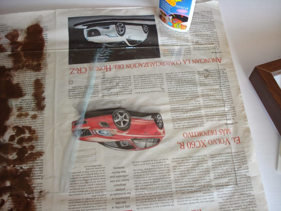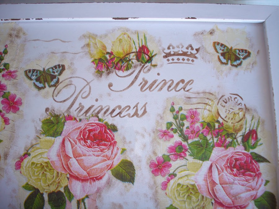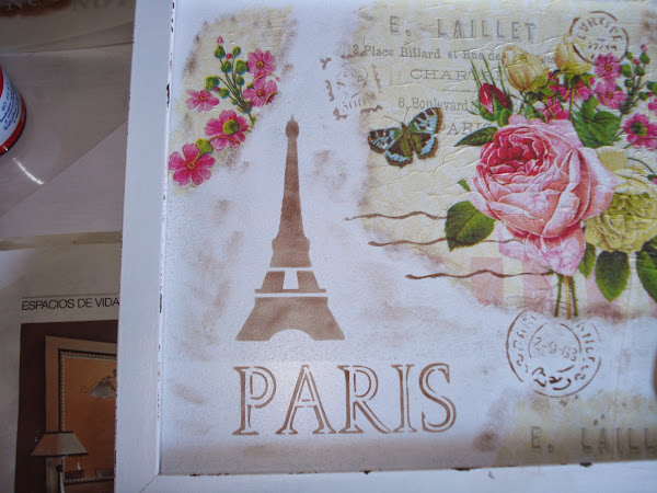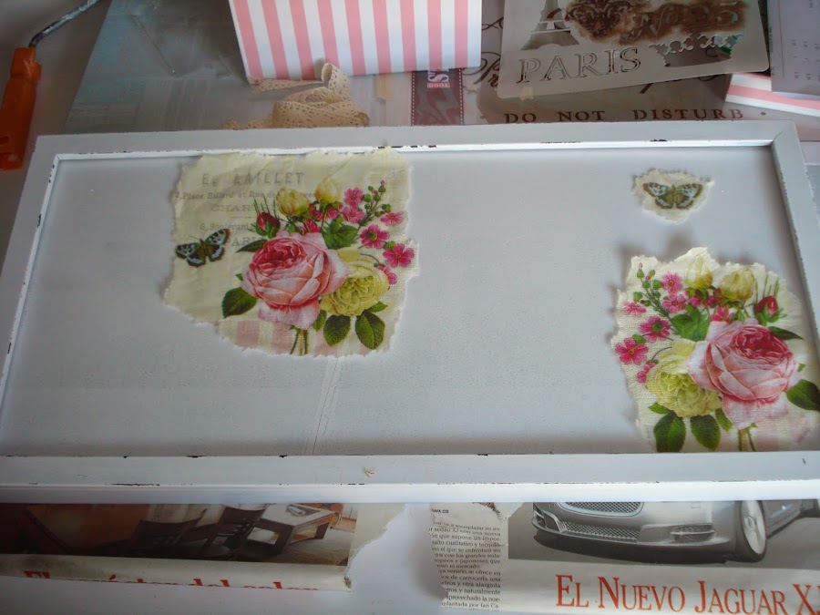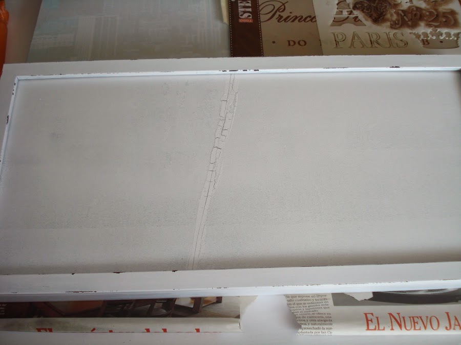 Pinté el cristal y el marco con una pintura al agua, color blanco roto. Pasé una lija fina por las esquinas para que saltara la pintura y dar ese aspecto envejecido. Se nota donde está pegado el cristal, pero una vez que ponga la servilleta ya queda disimulado.