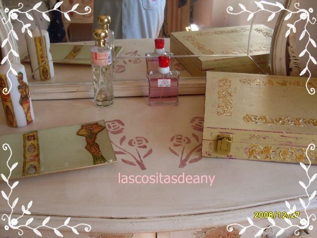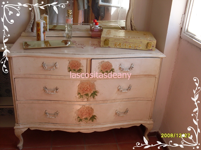 Empiezo con la comoda,era antigua,muy fea,y asi me ha quedado...los pasos los de siempre,lijar mucho,imprimacion,pintura color blanco roto,pegar los motivos en las cajoneras,craquelar con el alkil y vallejo,y despues enveci con cera y betun de judea