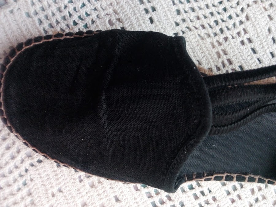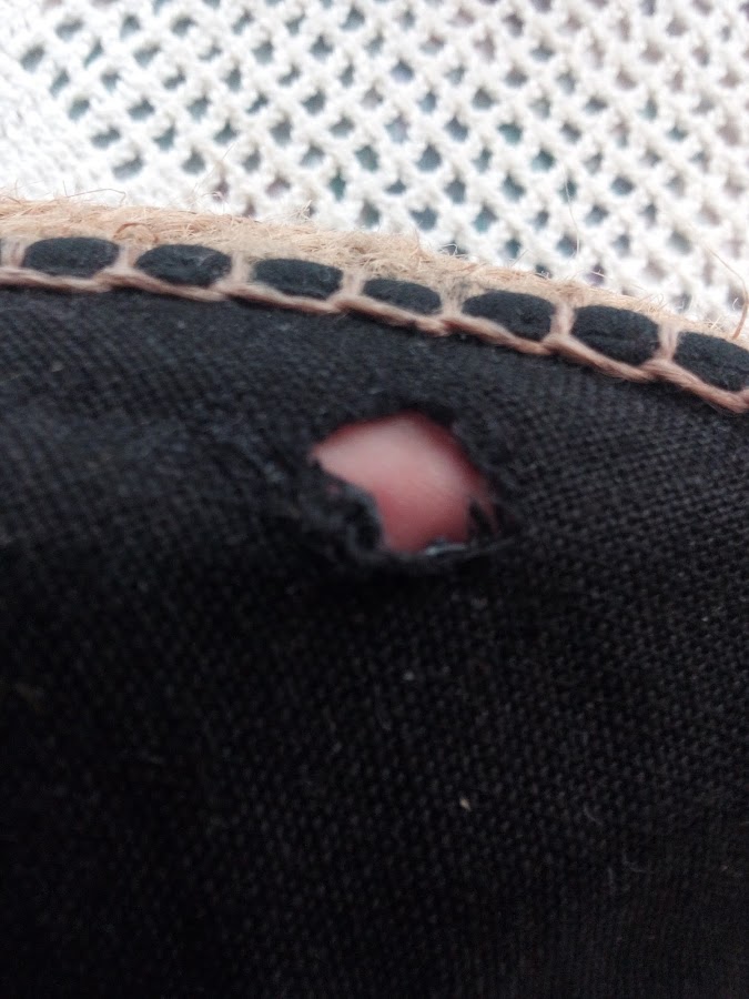 Y os preguntareis por que he dicho esto, pues porque las pobres se me agujerearon de tanto usarlas, como el amor que dice la canción que se acabó de tanto usarlo, pues así me pasó con las zapatillas. Este año al ir a comprar nuevas no había como las de siempre y como tengo unos piececitos tan maravillosos no me las pude comprar porque no había de mi número. Las del año anterior estaban nuevas pero con el agujero pertinente, aquí os dejo el bonito roto que está muy bien hecho pero queda un poco cutrecillo.