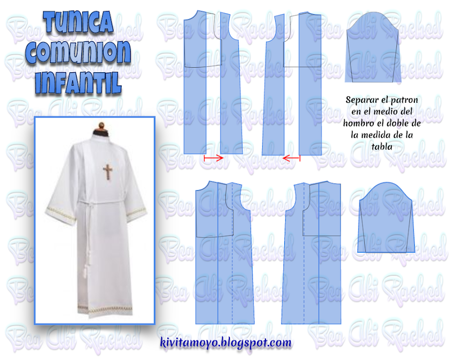 Usar el patron base a medida infantil para diseñar esta tunica. Dibujar la linea axuiliar donde estara el tablon. Separar el molde por esta linea la medida de la tabla por 2. Conservar la inclinacion que demarca el patron base para dibujar la parte superior del tablon.