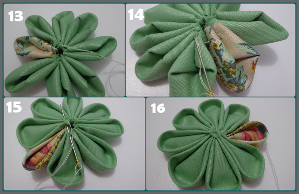 Hay algo que me parece importante que sepan acerca de la elaboración de esta flor y es que deben asegurarla muy bien con puntadas firmes pero no muy apretadas para podes dar forma y acomodar los pétalos adecuadamente.