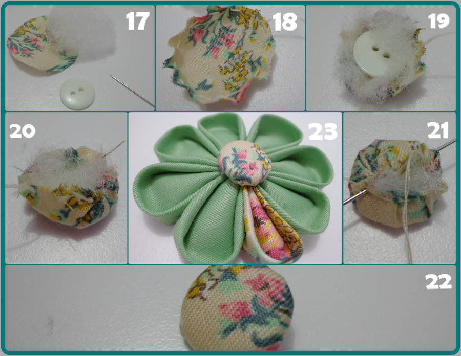 Yo les enseño aquí un centro para la flor que es un botón forrado en tela, pero ustedes pueden utilizar apliques que ya vienen listos, o botones con formas, también figuras en arcilla polimérica, yo los invito a que busquen en los almacenes donde venden artículos para costura y manualidades, siempre se encuentraaan cosas muy bonitas.