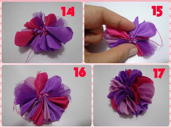 12. Ensartar los pétalos con aguja e hilo, estableciendo un ordén en los colores y repitiendolo con cuidado para que queden bien distribuidos los colores.