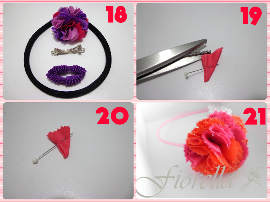 19.,20. y 21 Como alternativa pueden utilizar tijeras de picos para el corte y seguir el mismo procedimiento para obtener un lindo clavel.
