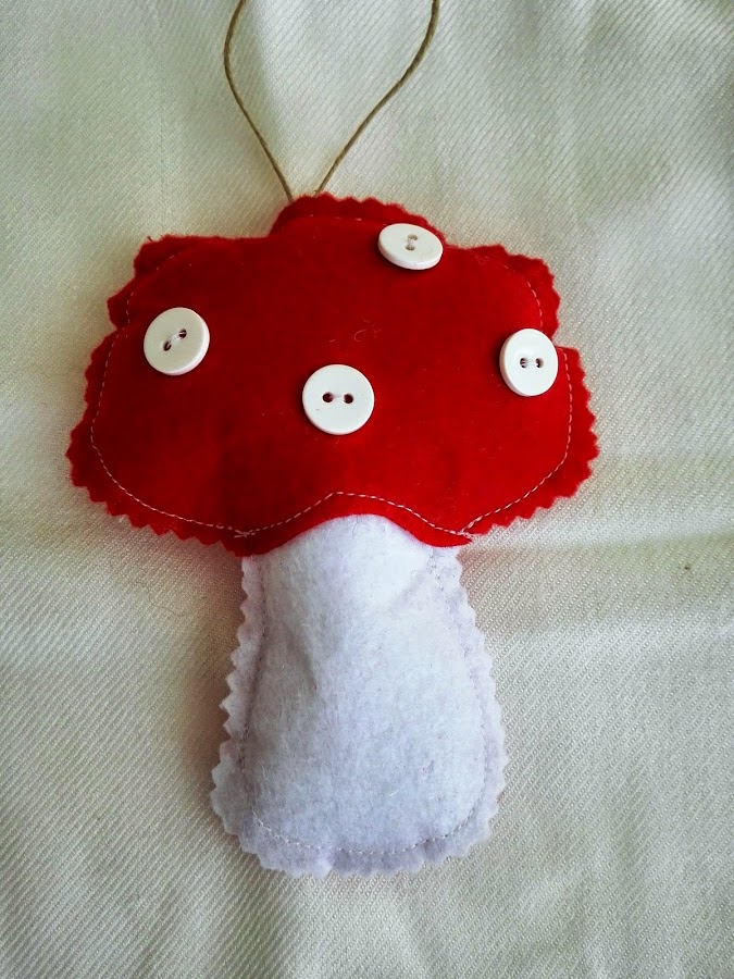 Cosemos el pié en blanco (seta 2) al sombrero en rojo (seta 1) por la marca discontinua en color rojo y cosemos de igual forma que los corazones. Cortamos el contorno con la tijera de zig zag. Adornamos con botones.