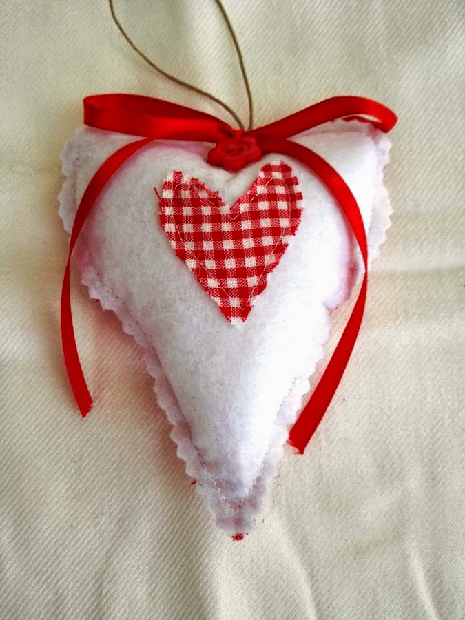 Encaramos revés con revés y cosemos siguiendo la forma del molde. Dejamos una pequeña abertura,e introducimos la guata y cerramos. Adornamos con tiras de tela y cuerda los corazones rojos. En los corazones blancos aplicamos un corazón en vichy antes de coser el contorno y adornamos con botón de flor rojo, lazo y cuerda. Con una tijera en zigzag cortamos el contorno de los corazones y listo.