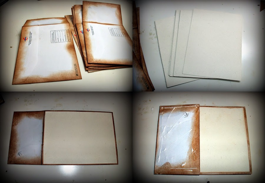 A continuación envejeceremos todos los lados, las dobleces de los sobres, intentando manchar bien para que luego no se vea el color blanco de los sobres.