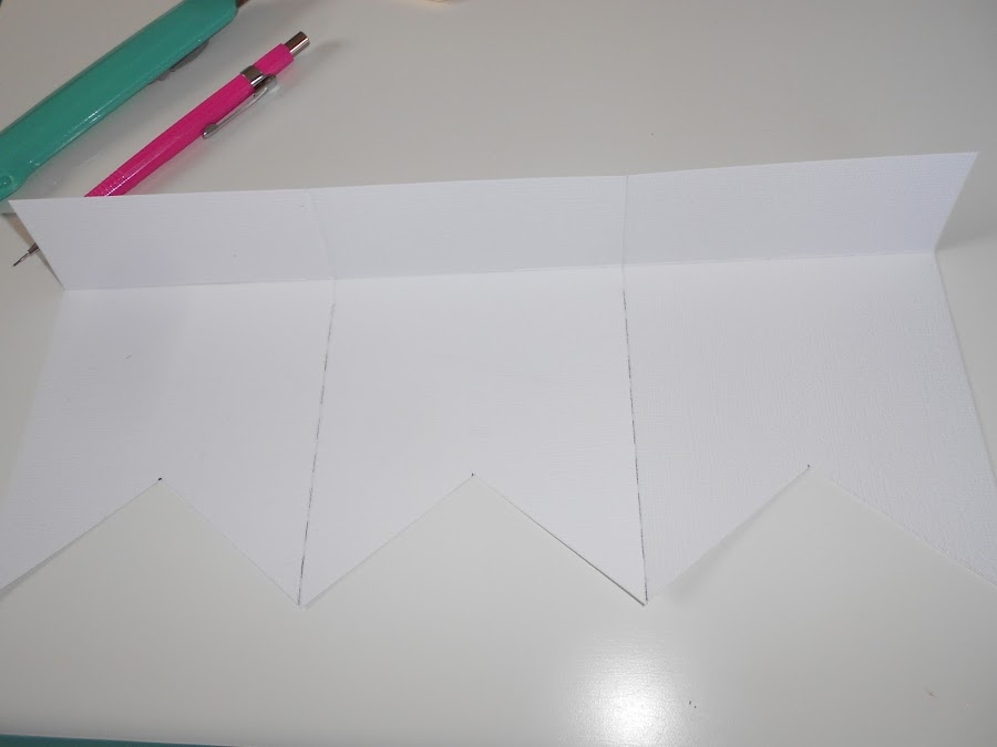 Y ya pasamos a cortar los picos de los banderines , para ello medimos la mitad de cada banderín y contamos 4 cm hacia arriba con la ayuda de una regla , marcamos un punto y cortamos desde el punto a la esquina y así con todos