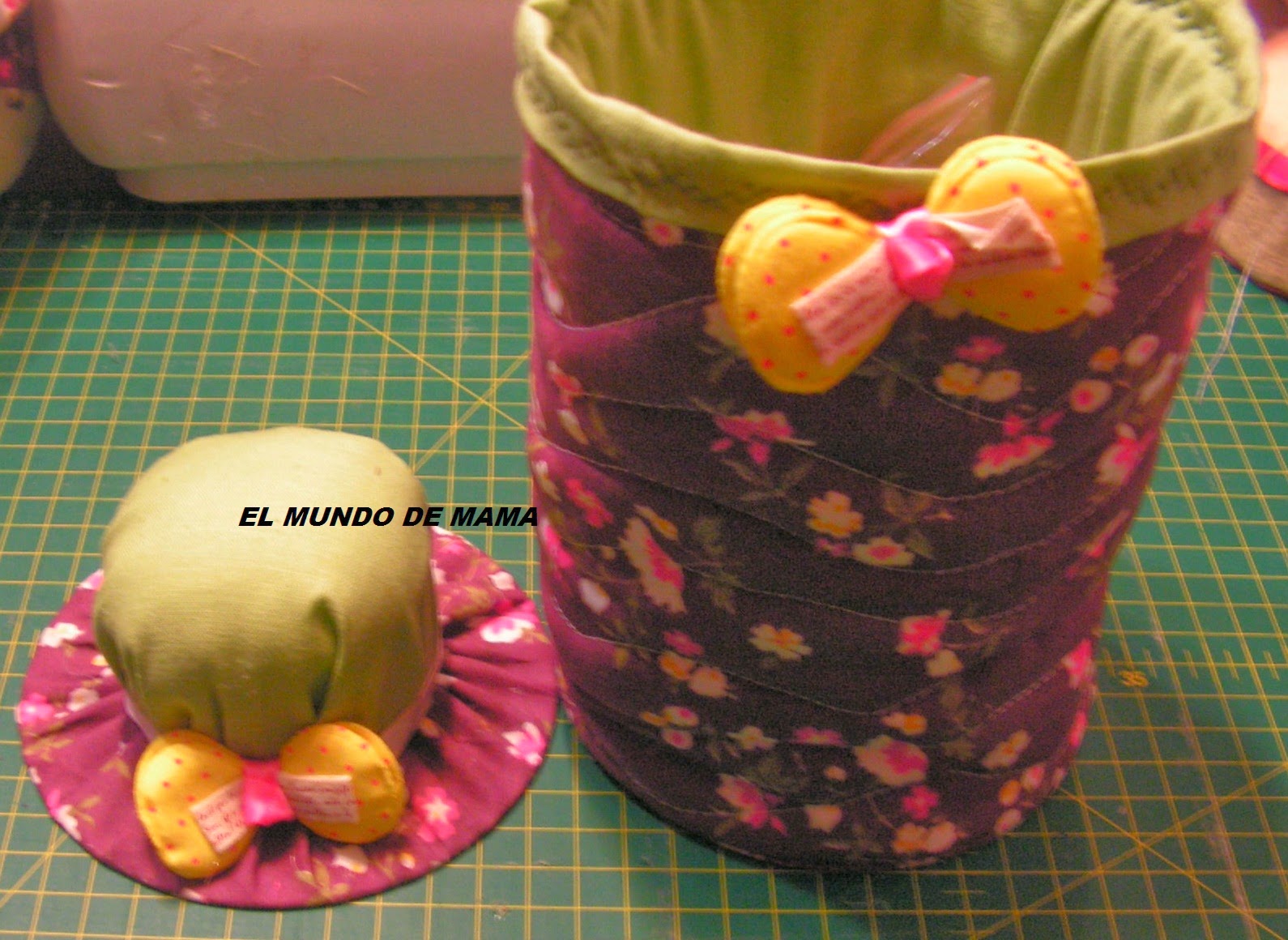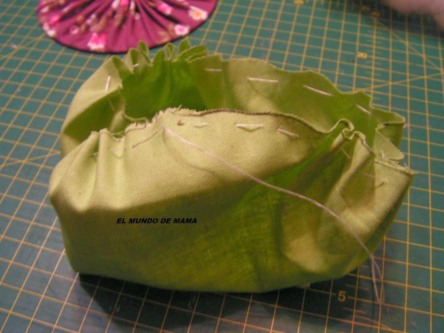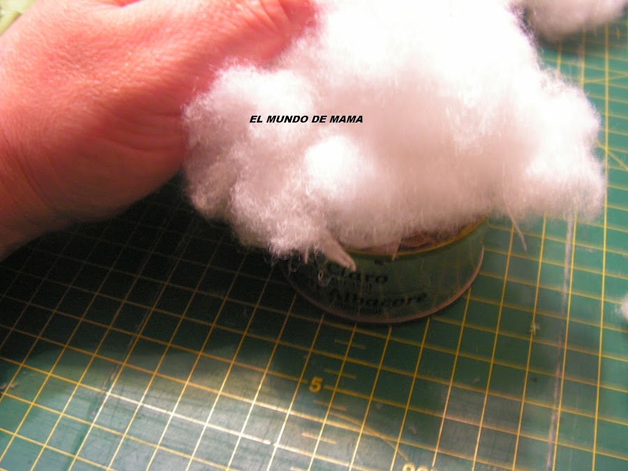 Y ponemos la guata en la lata de atun bien rellena , ponemos la lata cabeza abajo en la tela y cerramos, igual que hicimos con el cd