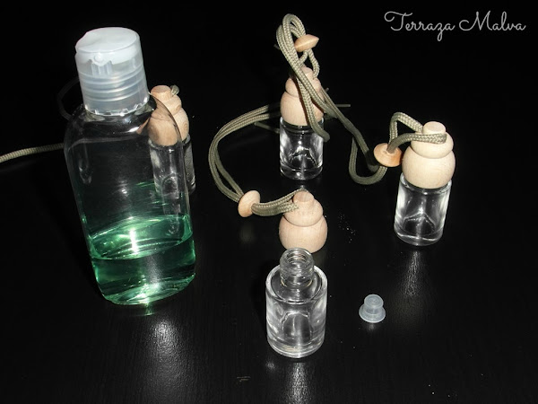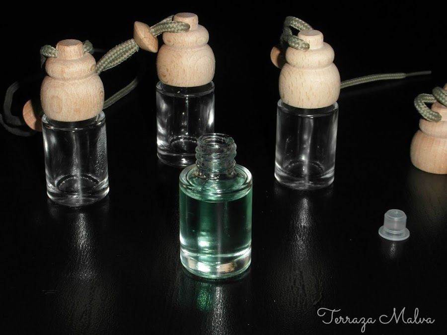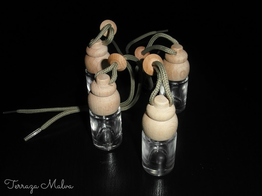 Para elaborar los ambientadores de coche he elegido unos botes en tonos neutros. Llevan un cordón para colgarlos y un pequeño tapón de plástico que hay que retirar cuando se vaya a usar el ambientador.