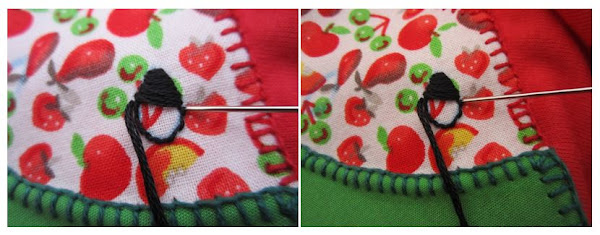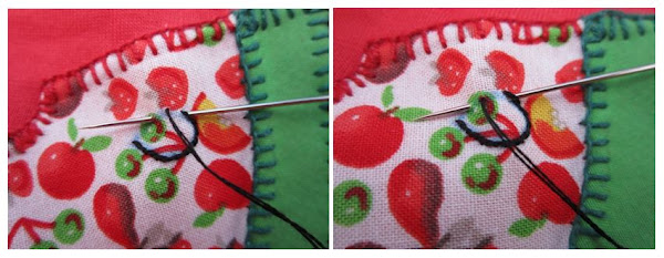 Y ahora cogemos el hilo nuevo y clavamos la aguja un poco separada del punto de antes, pasando el hilo por el último festón para que quede encadenado? ¡Y seguimos cosiendo!