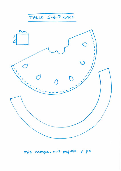 Aquí os dejo el patrón de la sandía en dos tamaños. Para camisetas talla 2, 3, o 4 años y para camisetas talla 5, 6 o 7 años.