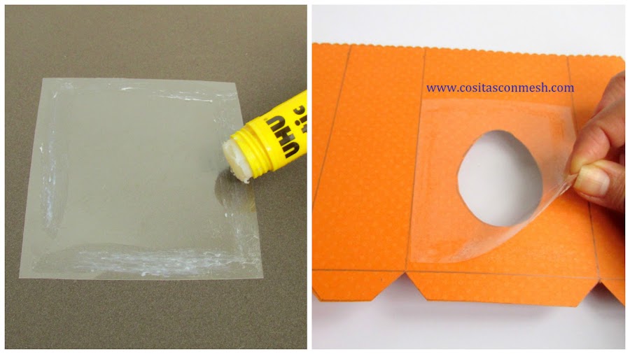 7.- Ya que tenemos toda la caja cortadita, taparemos la parte del huevo que cortamos, y para eso, usare acetato o mica. Uso pegamento en barra para pegarlo, sobre la parte del huevo.