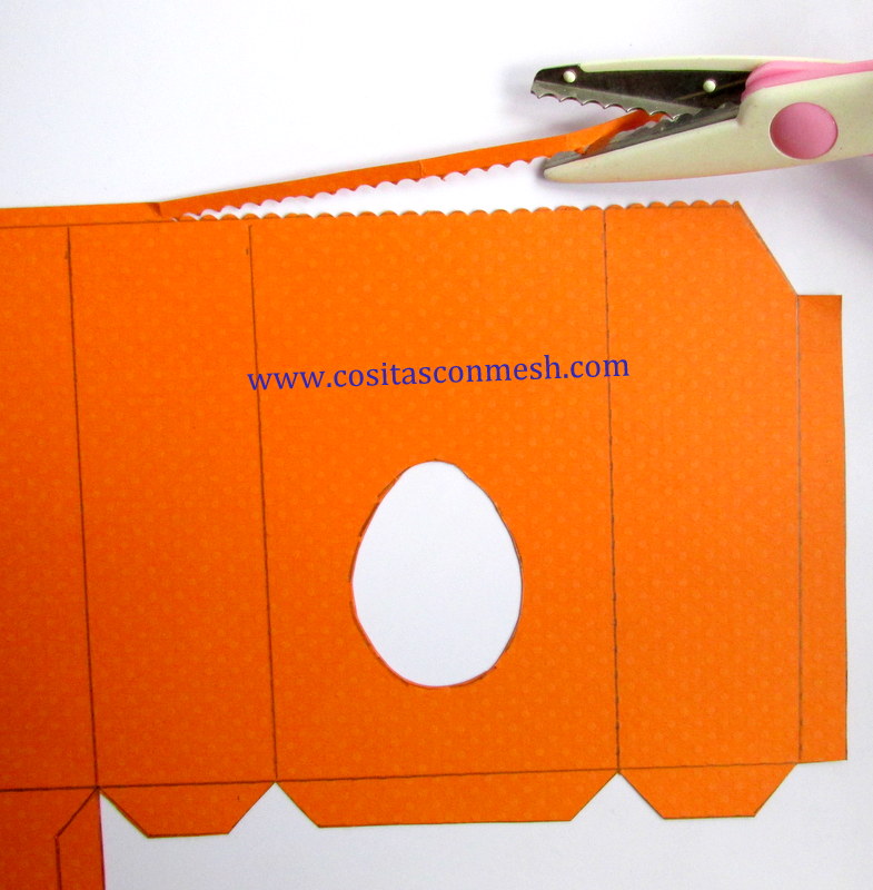 6.- Con una tijera zig zag, cortamos la parte de arriba de la caja de pascua.