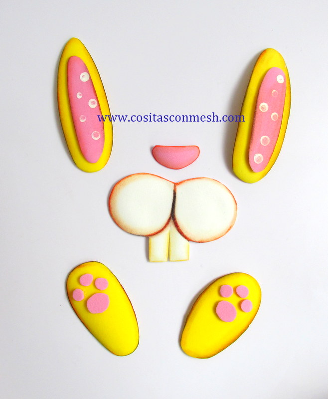 Para hacer el conejito, corto las patas y orejas en foami amarillo, los demás detalles vienen en foami color rosa.