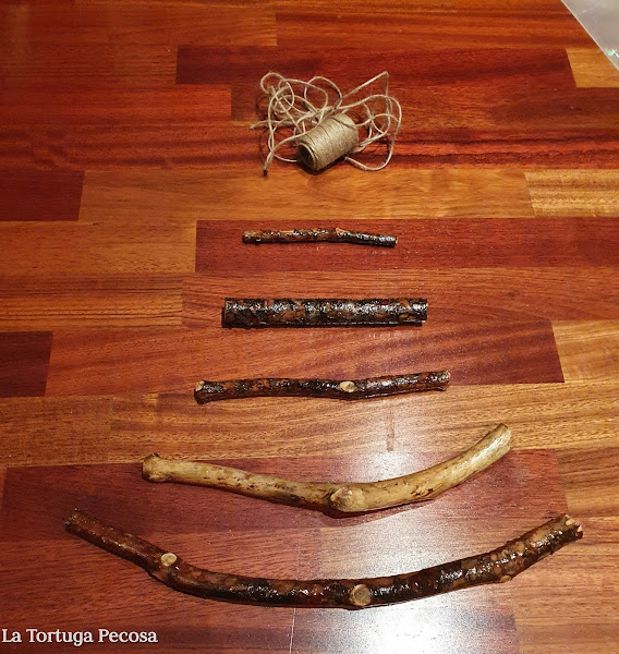 Y ahora...a componer. Con un total de 5 ramas de más grande a más pequeño, uniremos a través de una cuerda las ramas en sus dos extremos para equilibrar, a modo de escalera.