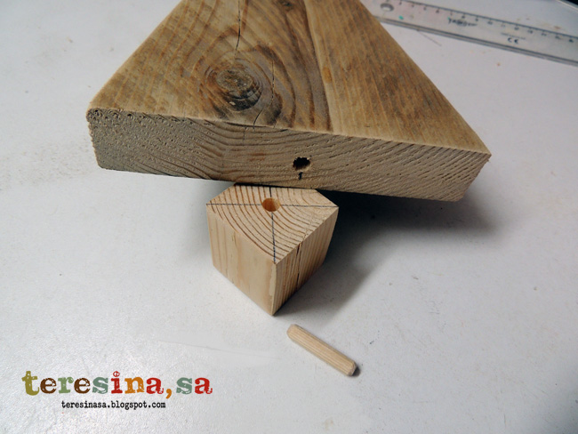 Ahora necesitaremos un listón cuadrado de pino. Cortaremos secciones de 3 o 4 cm que serán los troncos de los árboles. Marcamos las dos diagonales para determinar el centro y con la broca hacemos un agujero del tamaño del tubillón.