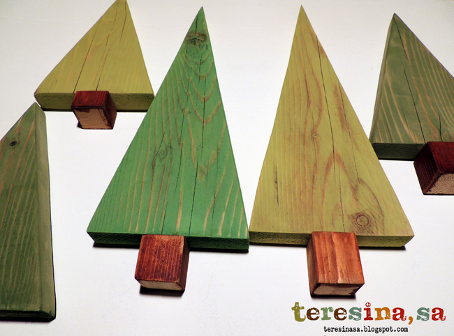 Los he pintado con una mano de pintura muy aguada, quería que se vieran las vetas de la madera. Los troncos marrones y el resto en diferentes tonos de verde.
