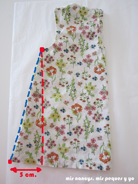 Y cortamos la tela dejando un margen de costura de 1 cm en todo el perímetro, menos en el bajo, que le dejamos unos 4cm (siempre estamos a tiempo de cortar). Ya tendremos el delantero.