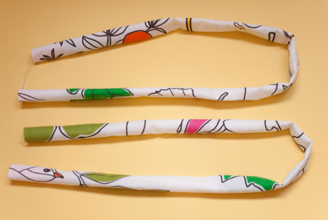 6. Una vez dadas la vuelta las asas, plánchalas y cose de nuevo un pespunte a un centímetro del borde por el lateral dónde te queda la costura que acabas de hacer.